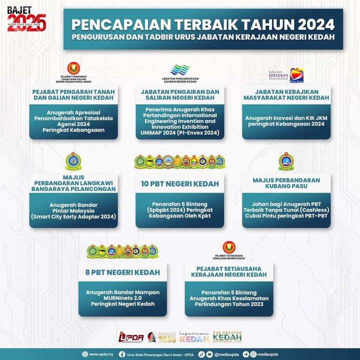 Kerajaan Negeri Kedah melalui pelbagai jabatan negeri telah melakar pencapaian yang membanggakan di peringkat negeri, kebangsaan dan antarabangsa pada tahun 2023 dan 2024. #UrusSetiaPeneranganDarulAman #sidangbajet2025 #UPDA -UPDA 11/24/2024, 8:30:53 PM